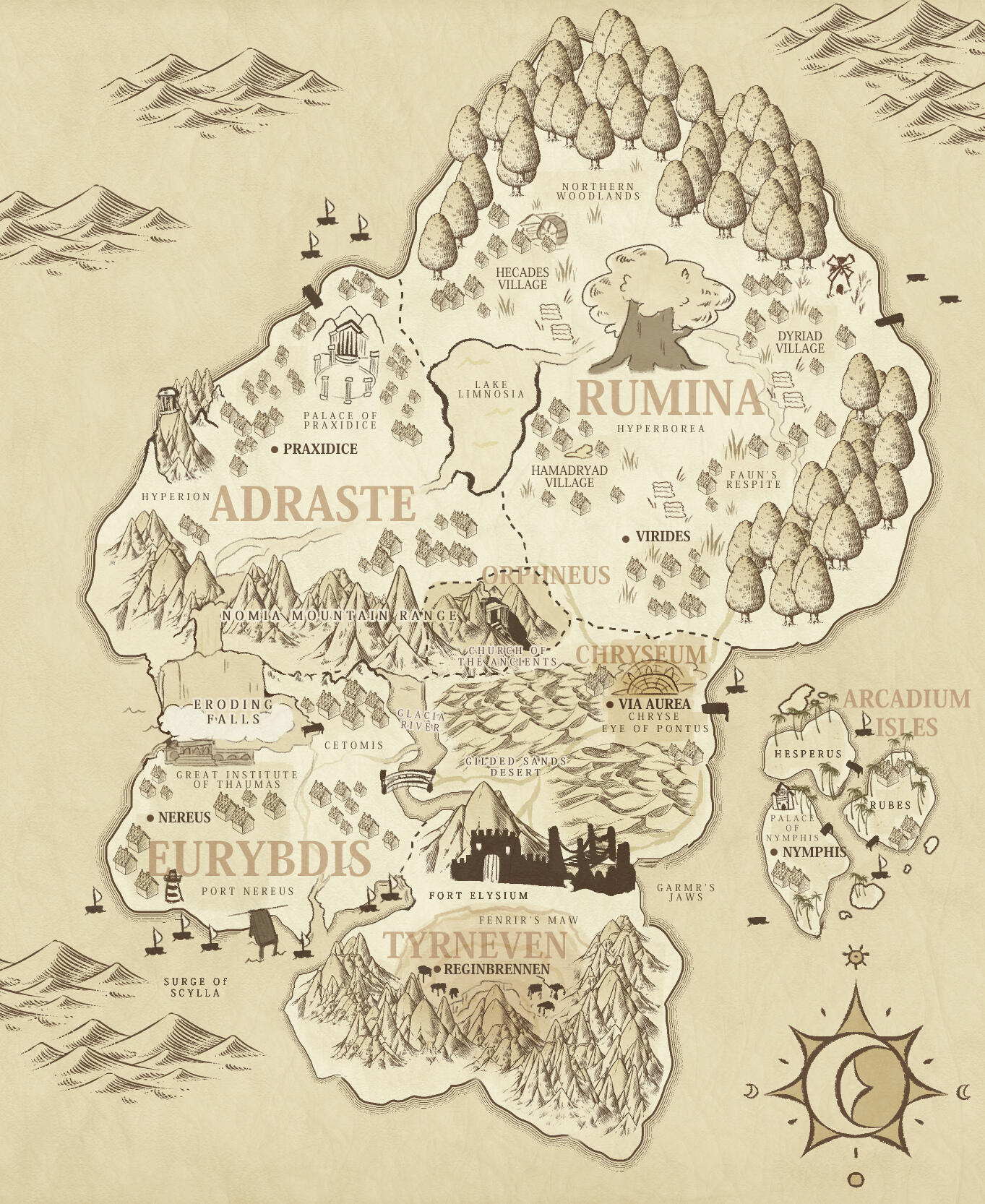 Nicknamed "The Everfair" due to the snow-covered marble buildings that tower over the people, Adraste is the dominion of The Adjudicator, Lady Euthemis.The country is known for its meticulous rules and severe punishments to those who break them. Government duties are taken care of by a group of officials called the Machina Delegatio, who publicly debate in the Platea Iuris, the central plaza of the Palace of Praxidice. Every last decision goes through Lady Euthemis herself before being approved or vetoed.Due to its high altitude, it's cold all year round and harvests are scarce, so they get food and other seasonal goods from the neighbouring nations. Because of their harsh climate, their main industry is focused on mineral extraction, which they then export to Tyrneven as material for forging.The national festival dedicated to their patron is Eurinomia, where people carve statues out of ice to symbolize the sturdiness of Adraste as a nation. It's also common for families to go to the mountain ranges to ride on sleighs and end the day at local taverns for a hot meal.