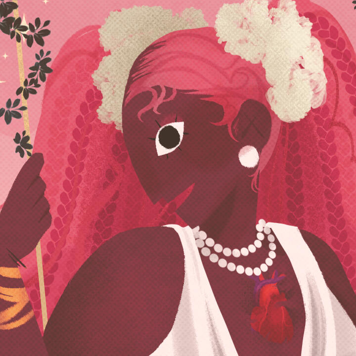 Ceres has light skin, adorned with beauty marks and red marks resembling tattoos across arms and legs. Her hair is an ashy blonde hue, long and messy, and her eyes are heterochromatic: left eye is green, right eye is amber. Her lips are usually upturned in a sardonic smile.She wears a multi-layered dress, made of fabric scraps, a veil and shawl made of transparent fabric, and many golden accessories (most notably, her sun and moon earring). She doesn't wear shoes.She's selfish and reckless: whatever she feels like doing, she will do, and there's little anyone can say to discourage her from acting on her impulses. Due to her immortality, she has no care for the safety of herself (or others). Her lifestyle is entirely driven by hedonistic pursuits, even if it's immoral or forbidden.
